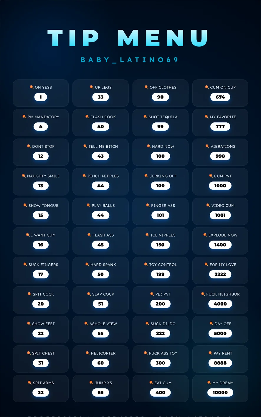 Cumshot, Deepthroat, Onani, Anal, Spanking, Erotisk dans, Stripping, Ejakulering, Fingring, Dildo eller vibrator, Fotfetish, Onaneringsinstruksjon, Ydmykelse, Analleketøy, Hardcore, Handjob, Twerk